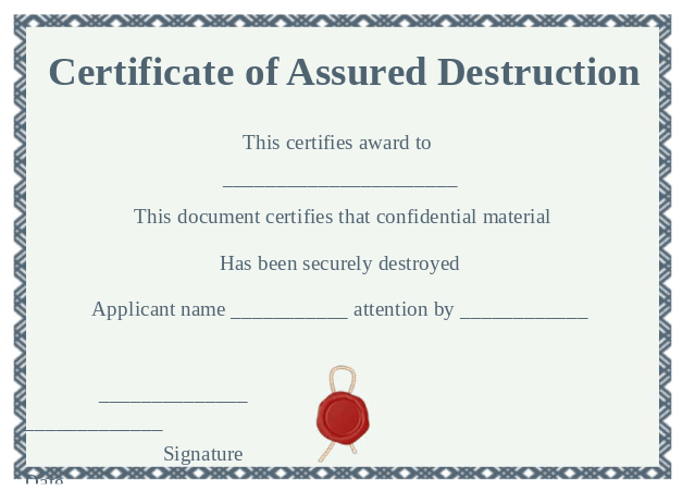 We offer a comprehensive data destruction service designed to ensure that your confidential files remain fully secure and protected from unauthorized access. Our specialized techniques encompass the secure destruction of hard drives, which guarantees the complete obliteration of sensitive information. Furthermore, we provide a certificate of destruction as evidence of our steadfast commitment to data security. By selecting our services, you can be assured that all remnants of your confidential documents will be permanently eradicated, thereby upholding your privacy and ensuring compliance with data regulations. While our certificate is available for the destruction of atleast 10 hard drives or storage devices, we extend our destruction services to all clients, regardless of the quantity. Below is an example of our certificate.